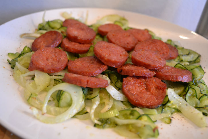 Zaterdag had ik op de markt venkel en courgette gekocht, nog niet wetende wat ik er mee zou maken. Ik wilde er een salade van maken, Daan kwam op het idee om er gebakken chorizo bij te bakken als tegenhanger van de frisse courgette en anijsachtige venkel, lekker pittig en zout.